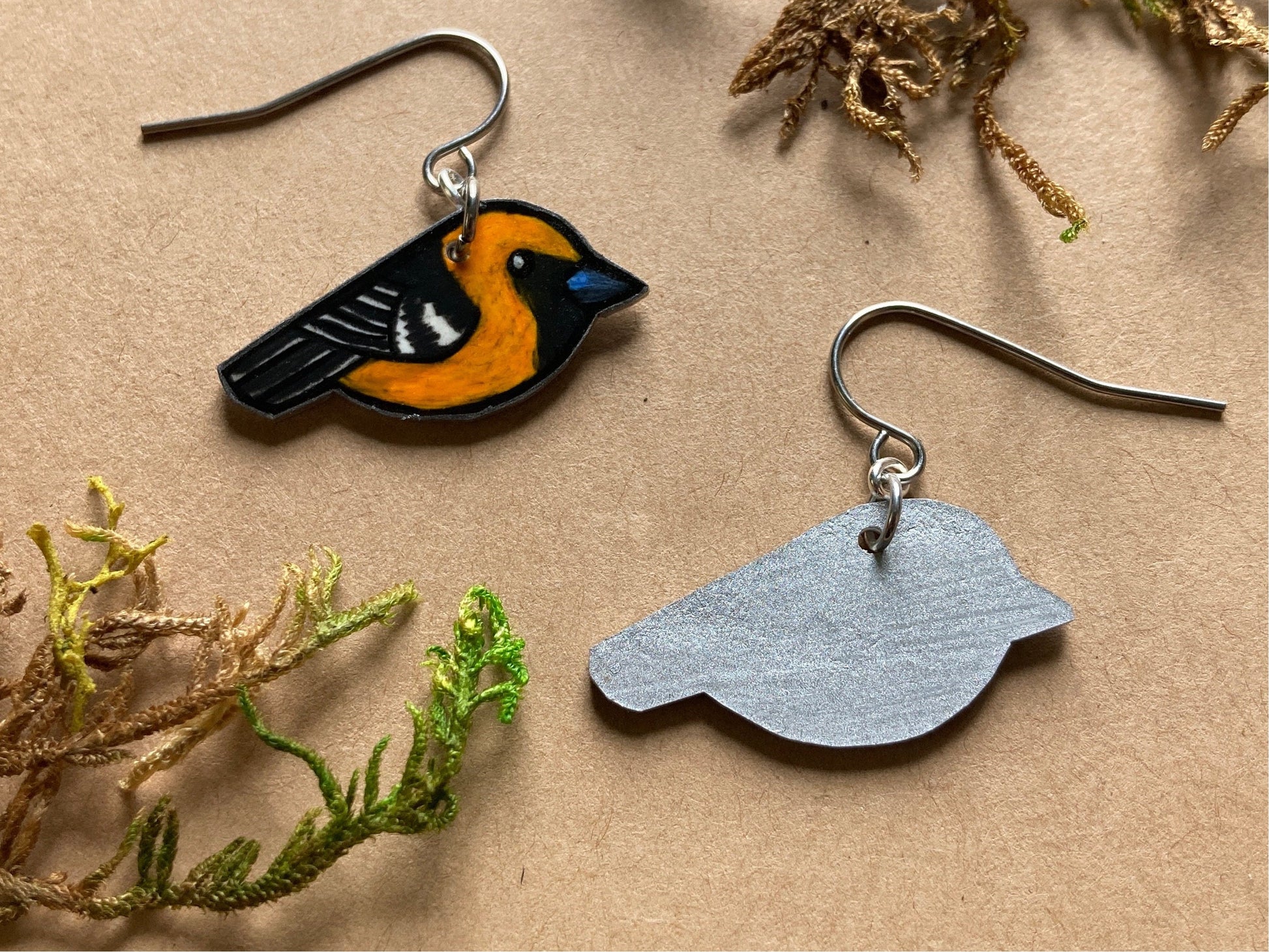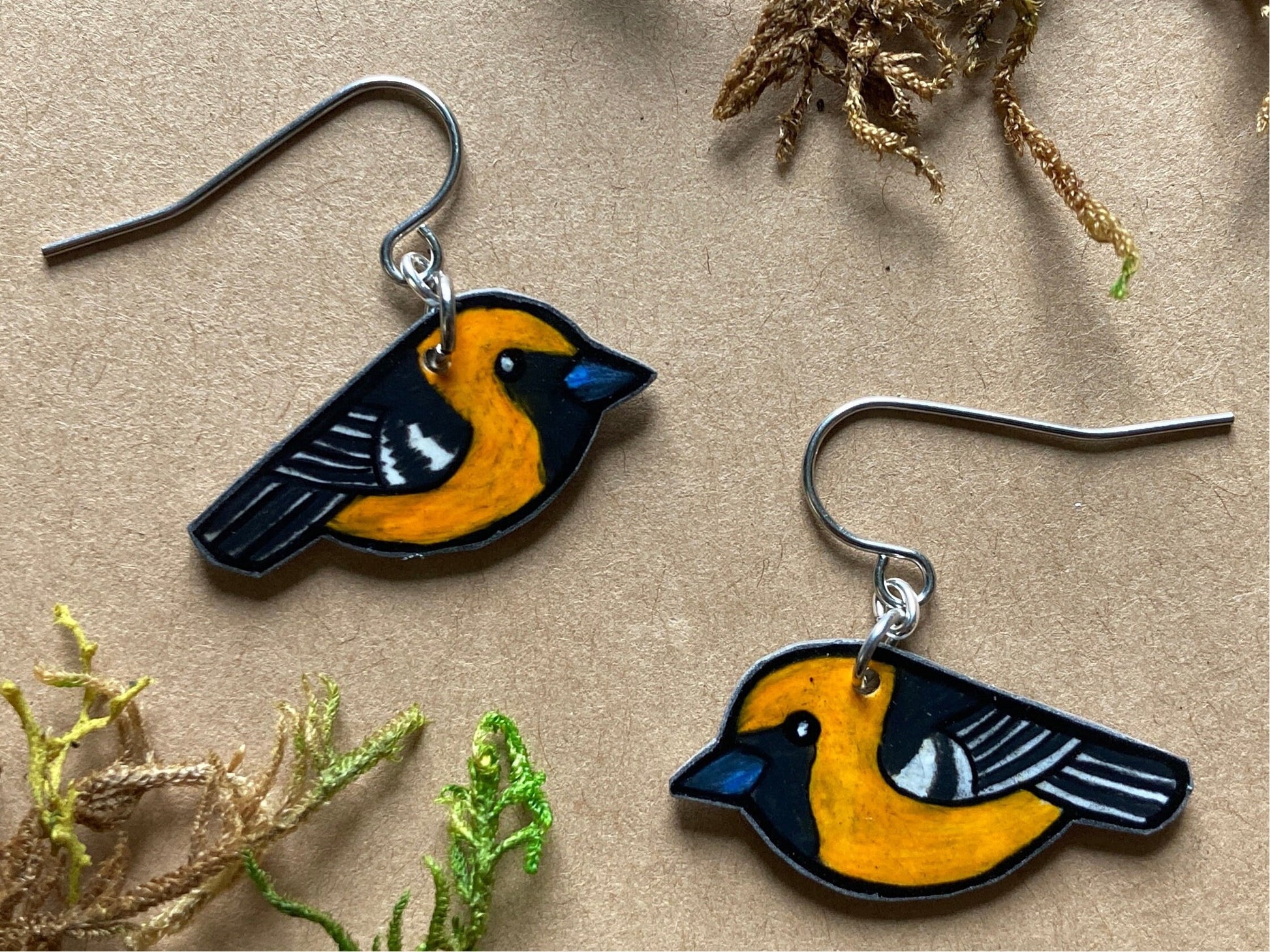 Lightweight dangling earrings featuring hand-drawn hooded orioles on surgical steel ear hooks. I draw little birds using professional grade oil pencils onto high quality shrink plastic and craft them into these super lightweight dangling earrings. Each piece is drawn by hand, so you’ll own your own little original piece of art!