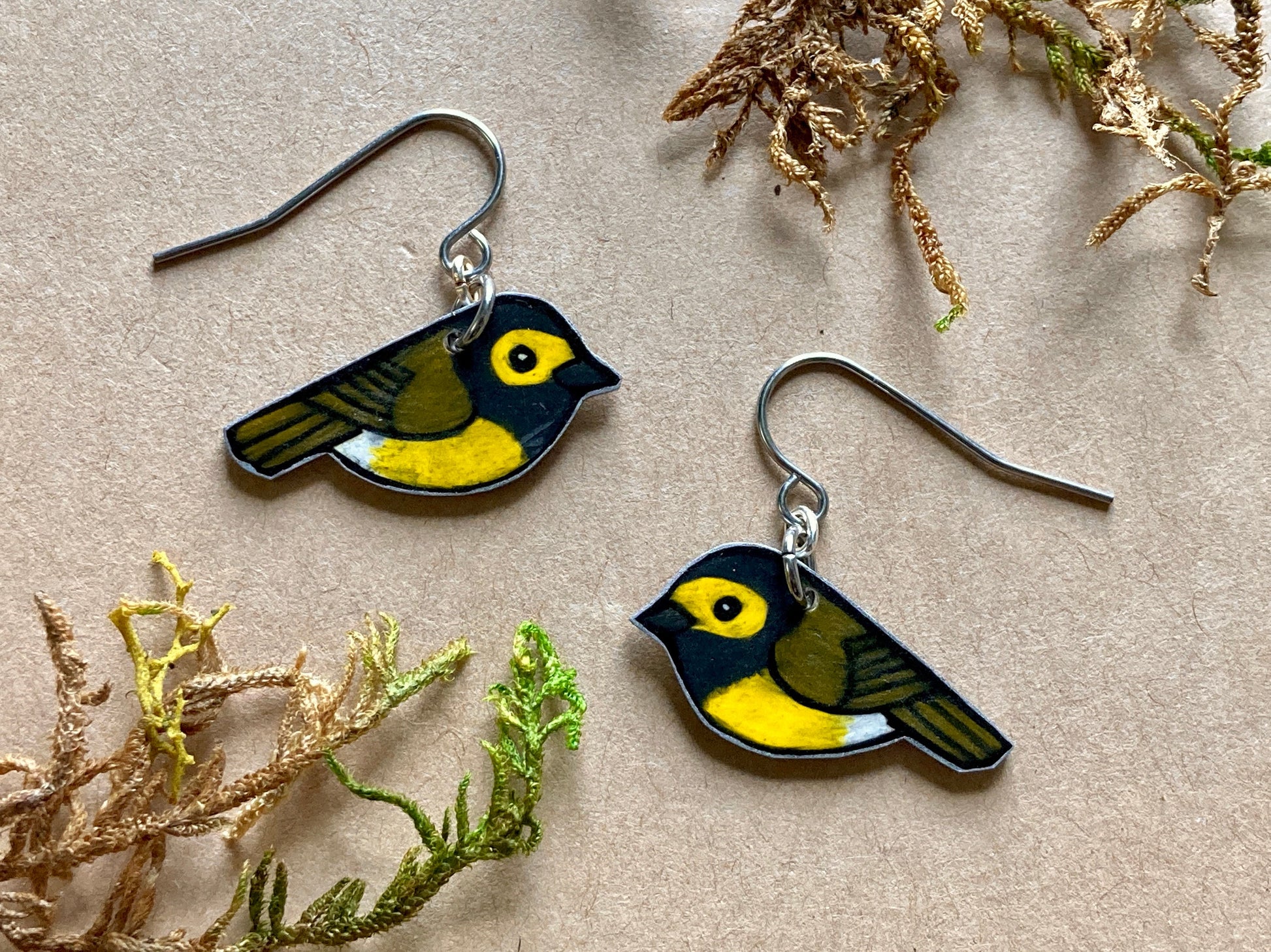 Lightweight dangling earrings featuring hand-drawn hooded warblers on surgical steel ear hooks. I draw little birds using professional grade oil pencils onto high quality shrink plastic and craft them into these super lightweight dangling earrings. Each piece is drawn by hand, so you’ll own your own little original piece of art!